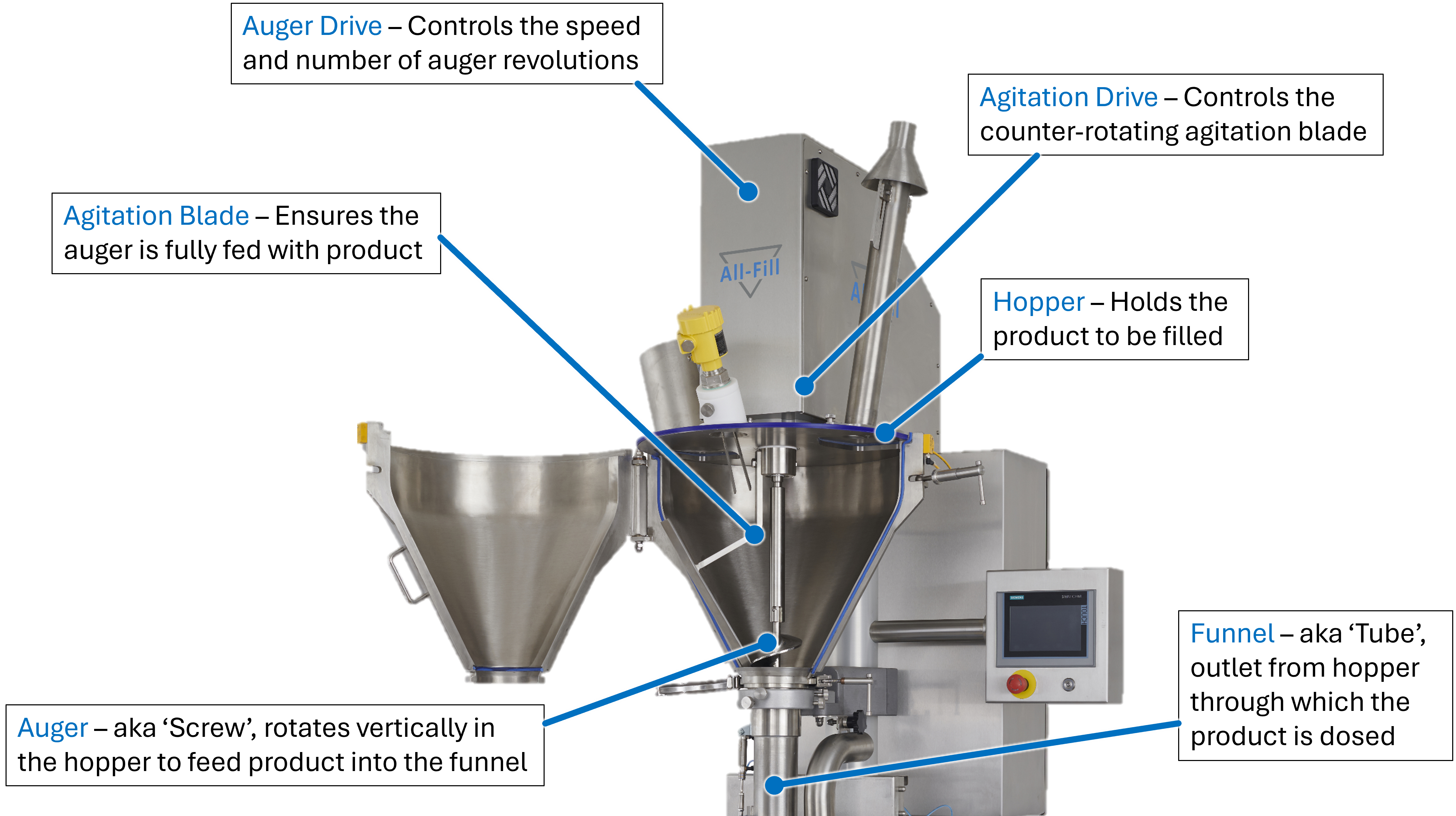 This image outlines the basic components that ensure consistent, accurate filling across all of our range of filling machines – whether required to fill 25kg sacks or 25mg pharmaceutical vials, our machines operate on the same basic principles at their heart.